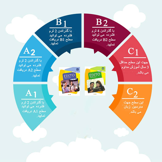 در دوره های عمومی زبان که با متد Edito آموزش داده می شود. کتابهای کمک آموزشی نیز در کنار متد آموزشی به صورت اجباری در کلاس ها تدریس می شود. کلیه دوره ها ایام هفته به صورت فشرده می باشد . سایت ها و دیگر منابع آموزشی نیز در کنار این متد به دانشجویان معرفی می گردد.