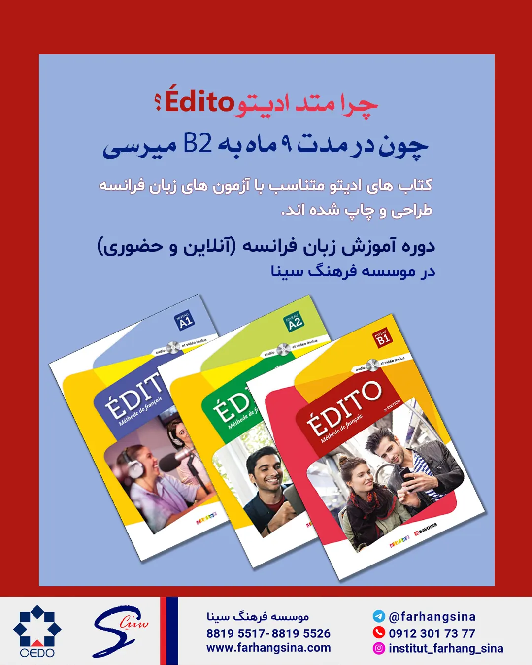 Édito یکی از بهترین متدهای آموزشی برای زبانآموزان مبتدی تا پیشرفته است. این مجموعه شامل ۵ سطح از A1 تا C1 میباشد و تمرکز آن بر یادگیری کاربردی زبان فرانسه است. نویسنده این سری کتابها مدعیست که متد بر اساس آزمون Delf طراحی شده و برای آزمون های زبان فرانسه موثر است.