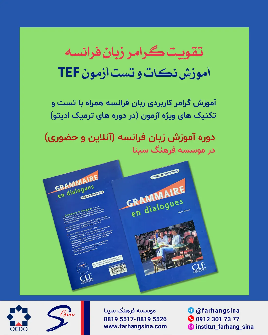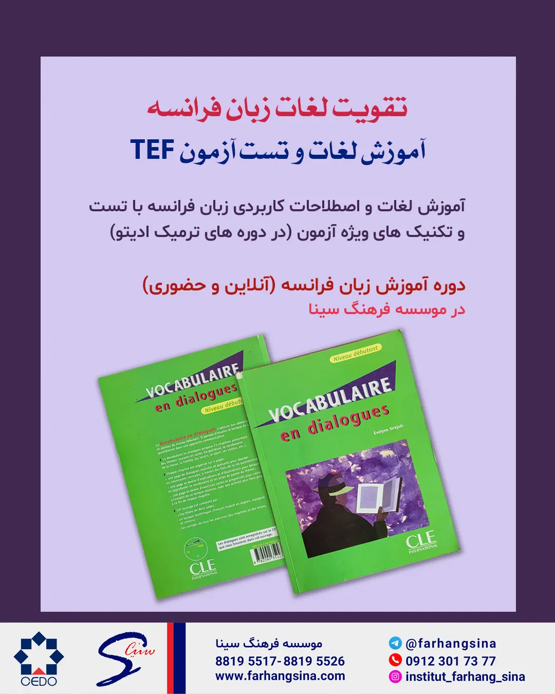 موسسه فرهنگ سینا برگزار کننده دوره های ترمیک زبان فرانسه حضوری و آنلاین، دوره های تقویت مهارت شنیداری، تقویت مهارت گفتاری و نوشتاری برای شرکت در آزمون TEF