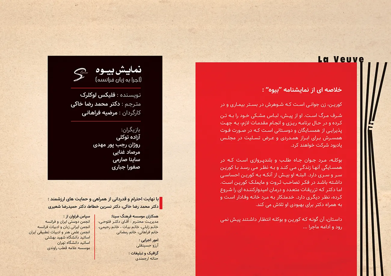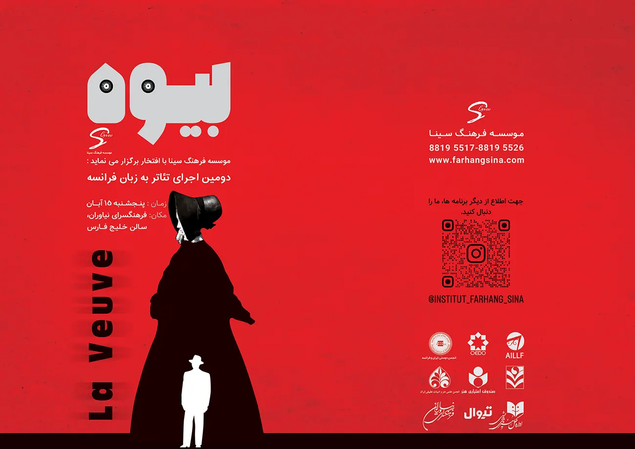 دومین اجرای تئاتر به زبان فرانسه توسط موسسه فرهنگ سینا، پنجشنبه 15 آبان درفرهنگسرای نیاوران، سـالن خـلیـج فـــارس برگزار گردید.